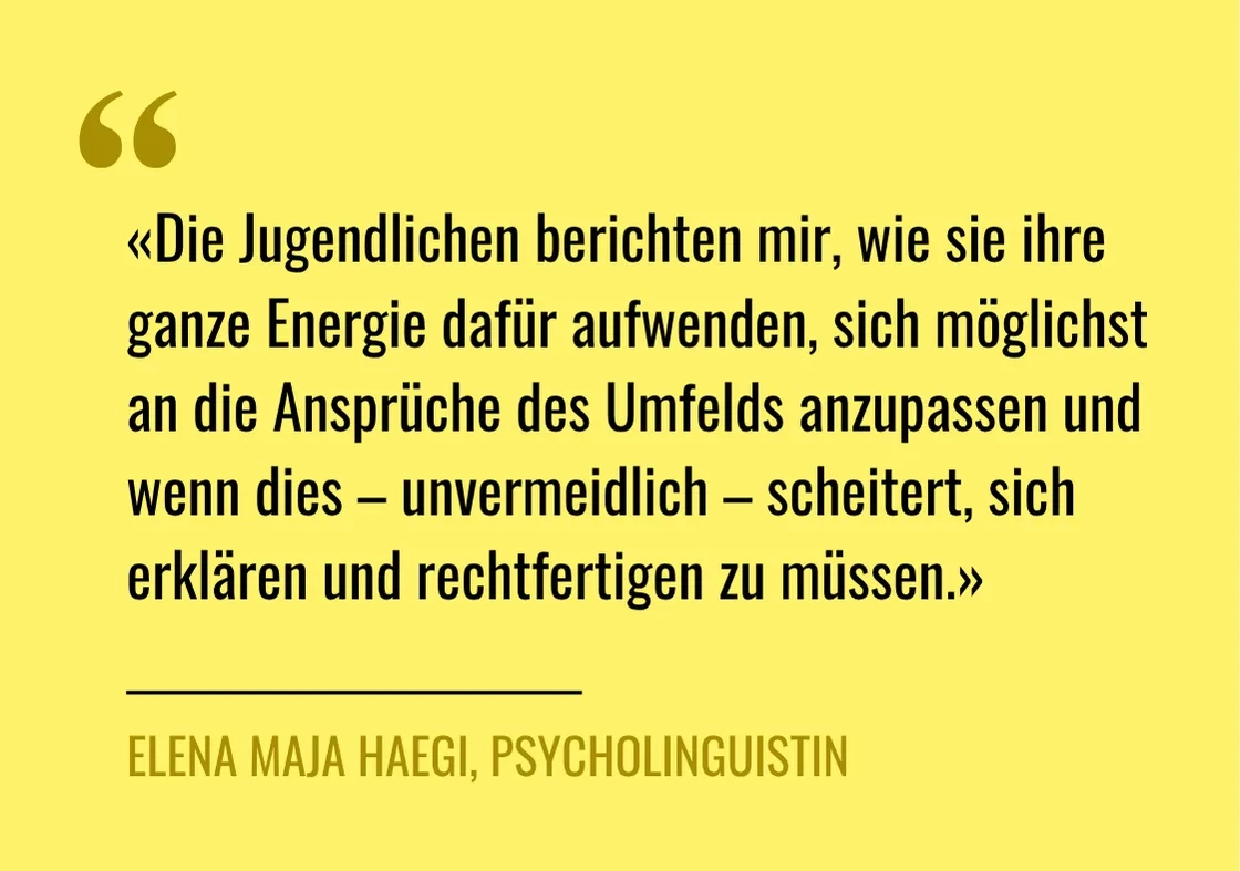 «Die Jugendlichen berichten mir, wie sie ihre ganze Energie dafür aufwenden, sich möglichst an die Ansprüche des Umfelds anzupassen und wenn dies – unvermeidlich – scheitert, sich erklären und rechtfertigen zu müssen», sagt Haegi.