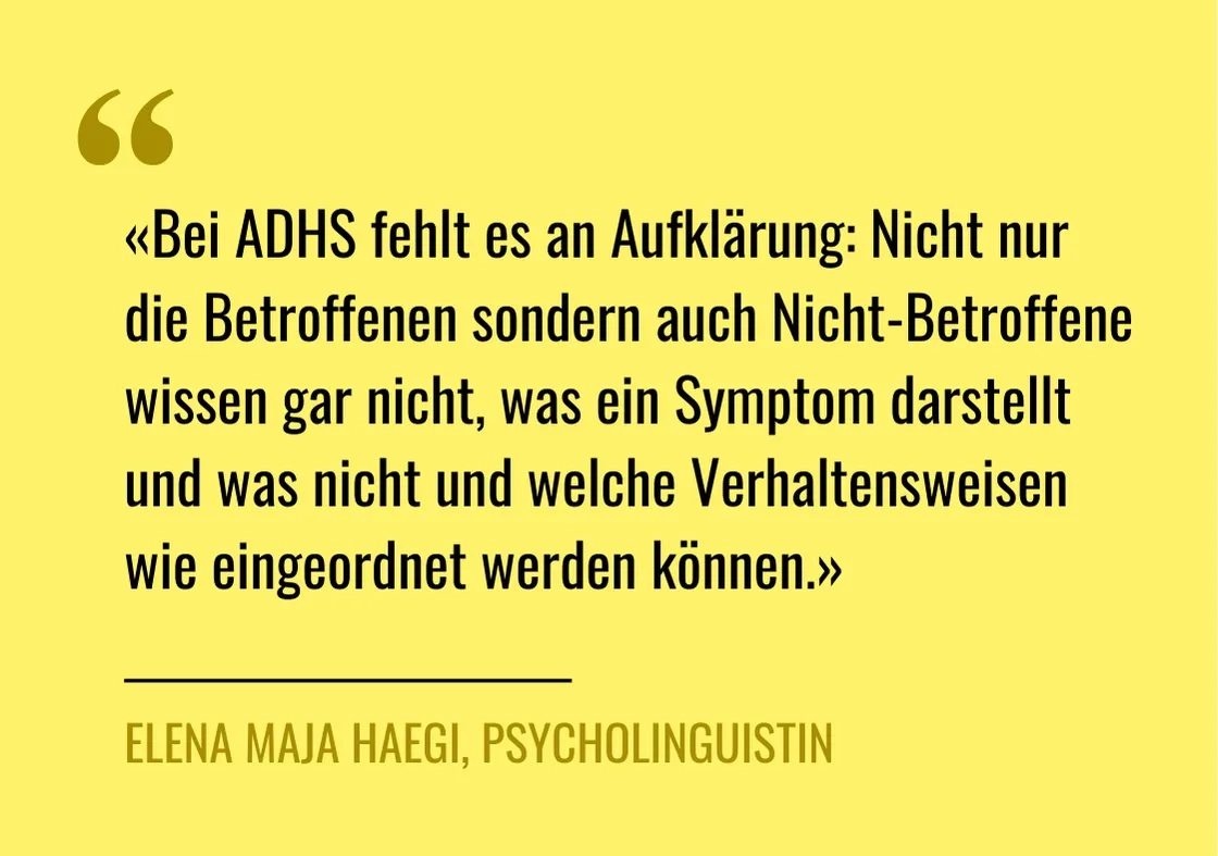 Diagnosen haben – bei aller bereits geäusserten Kritik – oft genau diese Funktion: «Diagnosen existieren im Prinzip bloss zur Einordnung. Gewisse Symptome treten in gewissen Verbindungen auf, entsprechend definiert man diese Cluster als Syndrom, Störung, Krankheit, mit dem Ziel, einen Behandlungsweg vorzuschlagen», erklärt Elena Haegi. «Bei ADHS fehlt jedoch die Aufklärung: Nicht nur die Betroffenen sondern auch Nicht-Betroffene wissen gar nicht, was ein Symptom darstellt und was nicht und welche Verhaltensweisen wie eingeordnet werden können.» Die Folge, insbesondere bei später Diagnostizierten: «Entsprechend ist es ein Schock zu erfahren, dass Eigenschaften, für die man in der Vergangenheit kritisiert und ausgegrenzt wurde, eigentlich ein Symptom sind.»